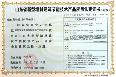 2013年10月10日,我公司生產的膨脹聚苯板薄抹灰外墻外保溫系統被山東省住房和城鄉建設廳列為山東省新型墻材建筑節能技術產品,具備了生產外墻外保溫系統的膠粘劑和抹面膠漿的條件。 另外,公司還研發了灌漿料、瓷磚膠、聚合物防水砂漿、內墻膩子、抗裂砂漿等新產品,部分產品取得了省級以上檢測機構的檢測報告。
