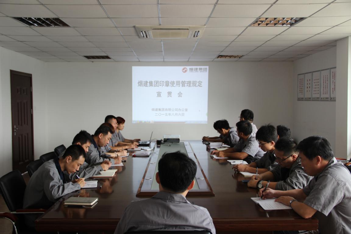 會上, 綜合處長楊瑞玉按照集團辦公室宣貫會的會議要求,宣讀了煙建[2015]27號《煙建集團印章使用管理規定》的文件內容,并對相關注意事項作了詳細講解。馬現來總經理在會上要求全體人員都要下載閱覽《煙建集團印章使用管理規定》,認真貫徹落實文件精神,做好印章管理工作,切實維護好公司利益,杜絕任何違規行為的發生。